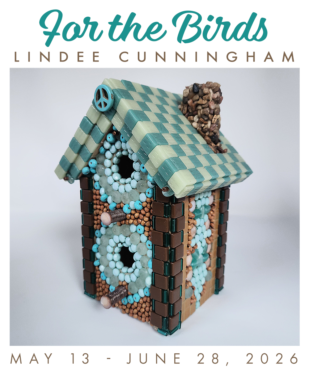 Lindee Cunningham has lived on the Oregon Coast for the past 42 years. She has been decorating bird houses for 10 years. Each house incorporates a checkerboard roof, peace symbol, and unique, colorful beadwork patterning.