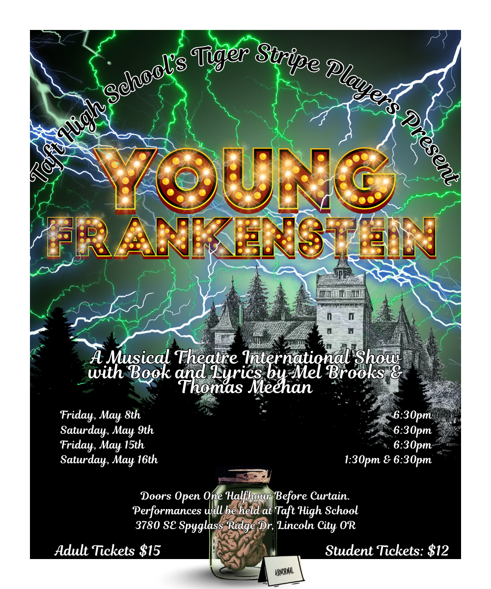 Taft High School’s Tiger Stripe Players present Young Frankenstein—the outrageously funny musical comedy by Mel Brooks and Thomas Meehan. Based off of the classic movie starring Gene Wilder, this musical follows the events that unfold when the grandson of the infamous Doctor Frankenstein joins the family business and creates a new monster. The show is packed with over-the-top characters, classic monster movie moments, and laugh-out-loud songs, that are perfect for teens and adults alike.
