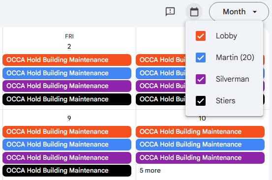 Each space is designated by a different color. Click the link at the top right of the calendar to view the color code and/or filter by individual spaces…